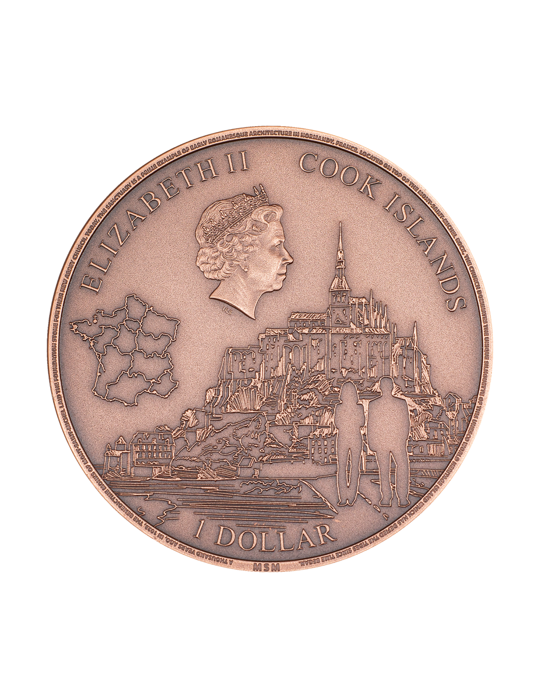 Cette superbe pièce de 50g en cuivre est dédiée au Mont Saint Michel, classé au patrimoine mondial de l’UNESCO depuis 1979. Cette pièce bénéficie d’un superbe design haut relief et d’une finition antique. Elle est livrée dans sa boite, accompagnée de son Certificat d’Authenticité.